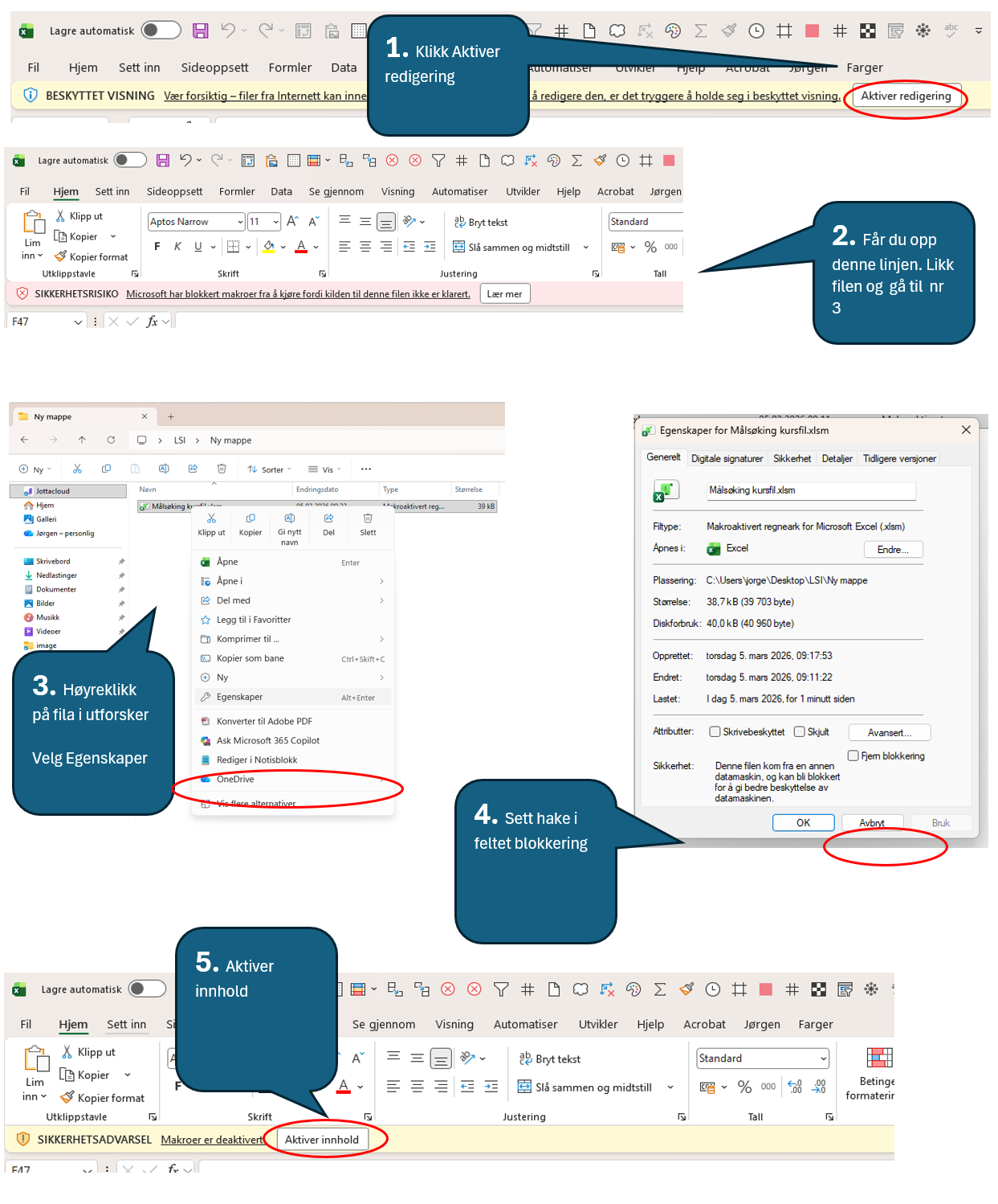 Filen bruker makro*, du må gi Excel tilgang til å bruke disse.